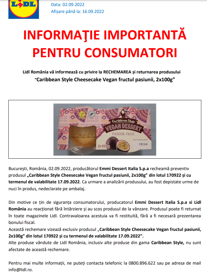 Lidl România vă informează cu privire la RECHEMAREA și returnarea produsului “Caribbean Style Cheesecake Vegan fructul pasiunii, 2x100g”.