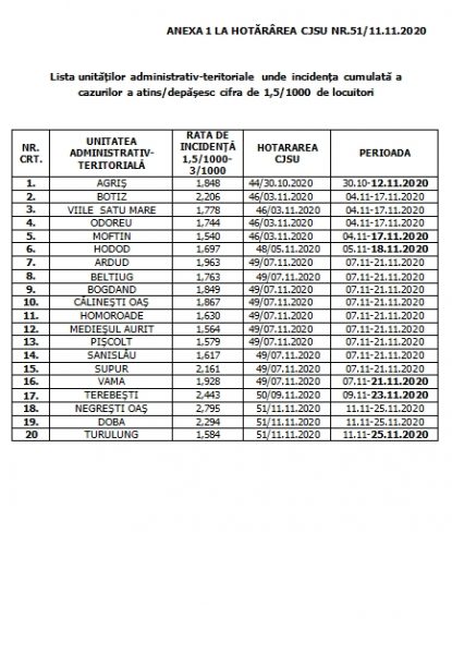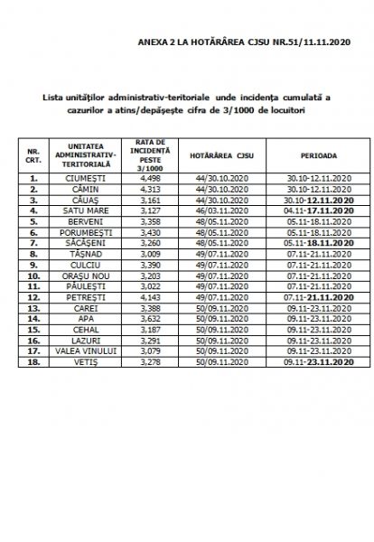 Art.2. Se aprobă lista unităților administrativ-teritoriale în care se aplică măsurile prevăzute în legislație de specialitate acolo unde rata de incidență a cazurilor de COVID-19 la 1000 de locuitori depășește limita de 3, conform anexei nr.2 care face parte integrantă din prezenta hotărâre.