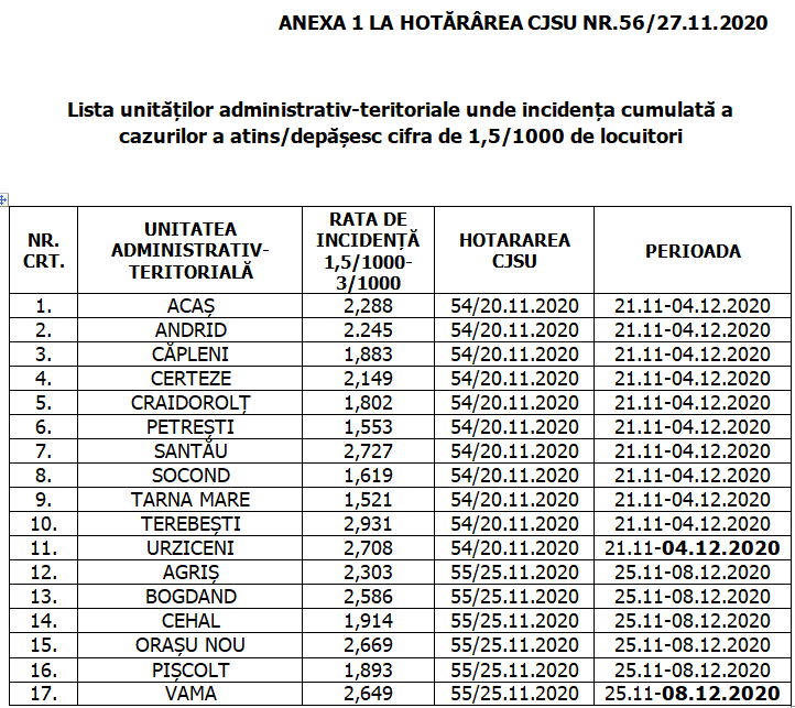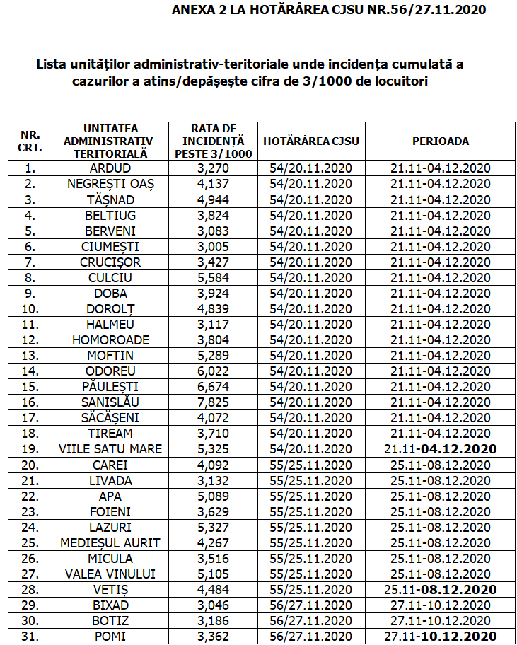 Prefectura Satu Mare a dat publicității lista orașelor și comunelor aflate în scenariul roșu, potrivit incidenței raportate de către Direcția de Sănătate Publică Satu Mare.