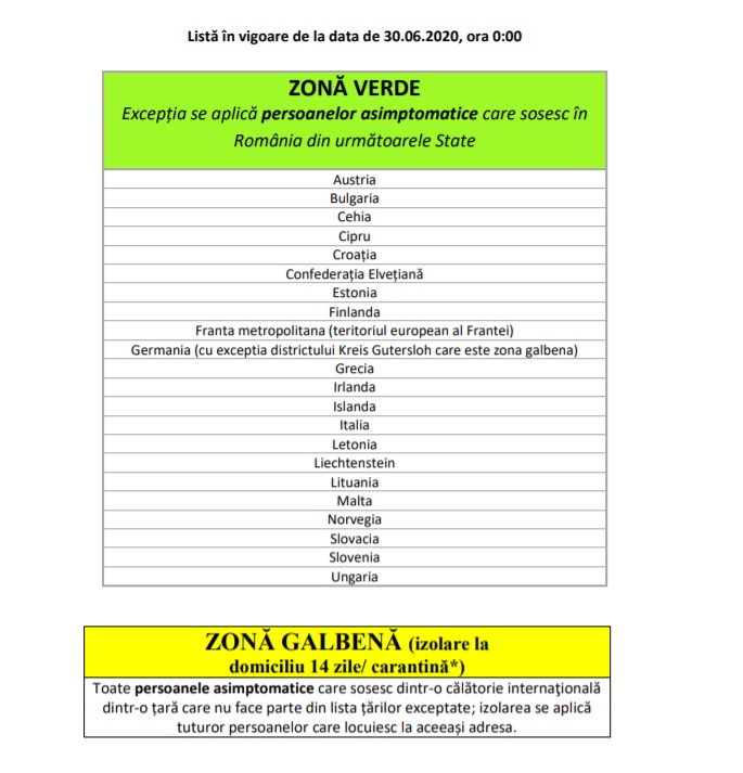 Conform Hotărârii nr 32 din 29.06.2020 a Comitetului Național pentru Situații de Urgență se menține valabilitatea listei publicată în data de 23.06.2020 până la stabilirea unui criteriu unitar la nivelul Uniunii Europene, se arată în noua decizie a CNSU.