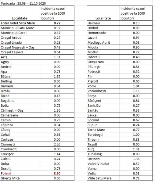 Prefectura Satu Mare a prezentat astăzi care este gradul de infectare în fiecare localitate din județul Satu Mare. Potrivit datelor valabile pentru perioada 28.09 - 11.10.2020, în peste 20 de localități nu s-au înregistrat cazuri noi. Topul infectărilor este condus de Foieni, iar rate ridicate s-au înregistrat și în Ciumești, Batarci, Călinești-Oaș și Urziceni.