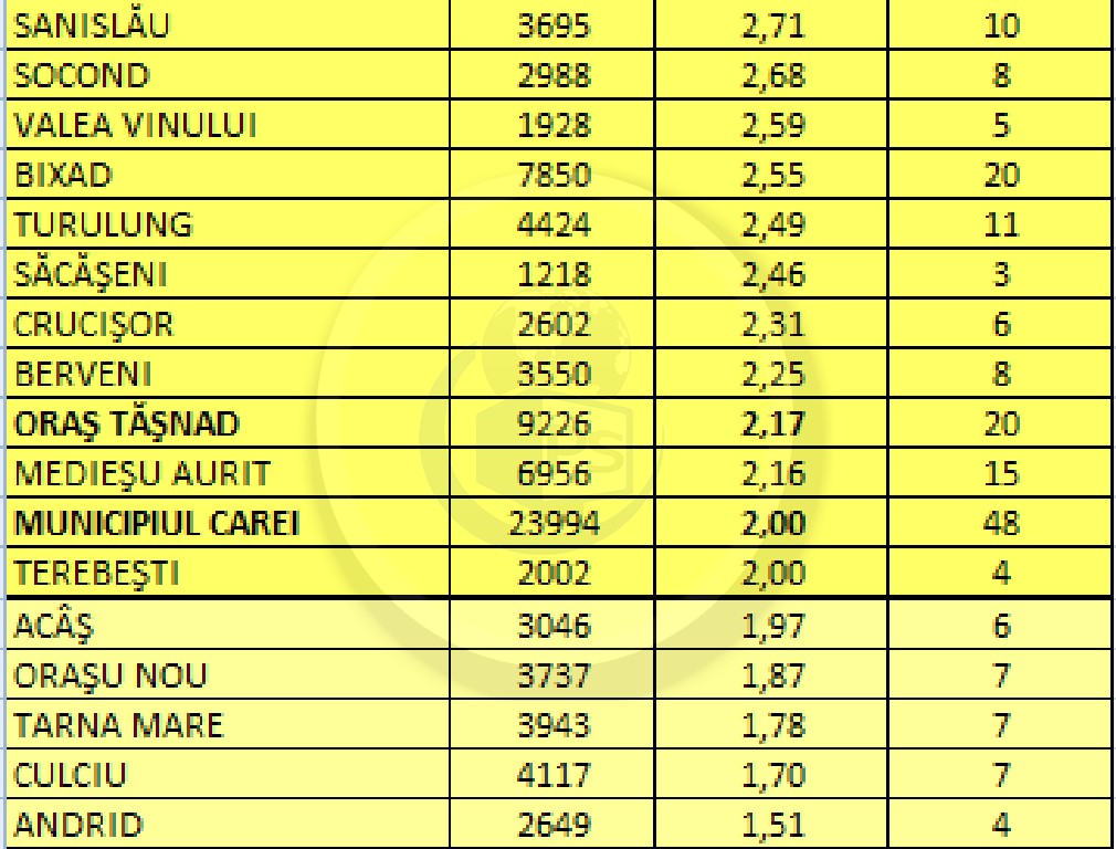 Municipiul Satu Mare rămâne la o incidență de peste 5 cazuri la mia de locuitori, în timp ce clasamentul celor mai crescute incidențe este condus de Viile Satu Mare, Cehal, Lazuri și Supur, cu Viile Satu Mare depășind pragul de șase cazuri la mia de locuitori.