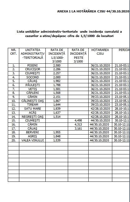 Art.1. Se constată depăşirea limitei de 3/1.000 locuitori a ratei de incidenţă cumulată a cazurilor pe ultimele 14 zile în următoarele unități administrativ-teritoriale: