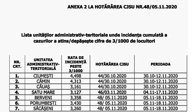 Potrivit Prefecturii Satu Mare, alte trei localități intră în scenariul roșu. Este vorba despre comunele Berveni, Porumbești și Săcășeni. Toate au înregistrat peste trei cazuri la mia de locuitori. Măsurile se vor menține până la mijlocul lunii noiembrie.