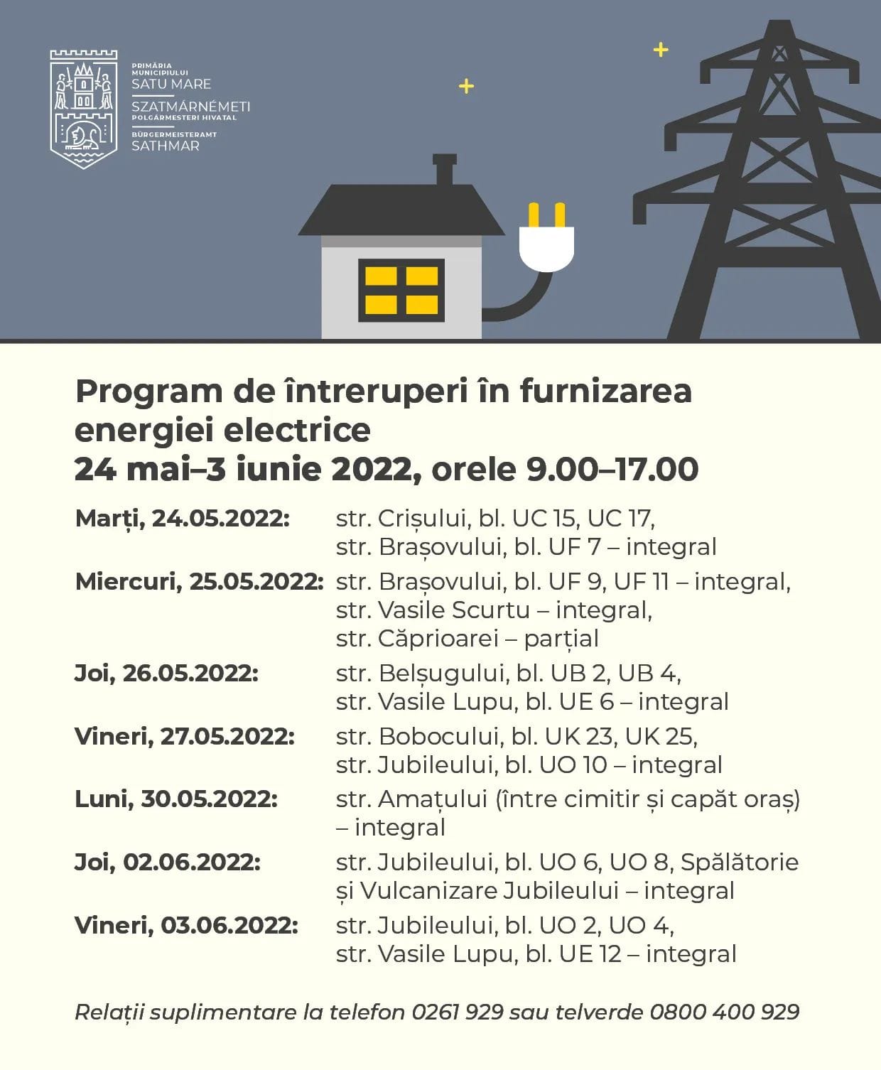Societatea de Distribuție a Energiei Electrice anunță întreruperea alimentării cu energie electrică în mai multe zone din municipiul Satu Mare.