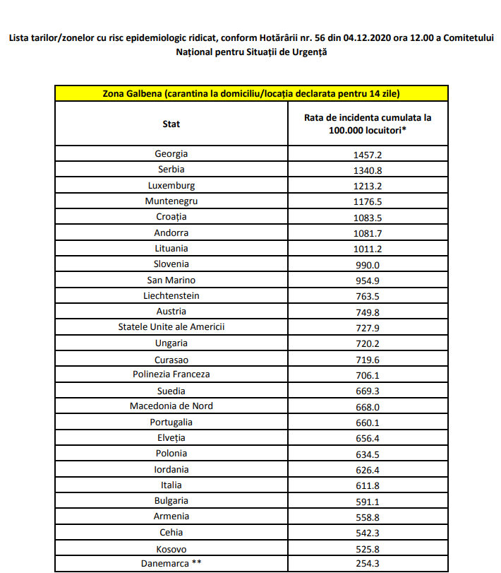 Institutul Național de Sănătate Publică a stabilit lista galbenă a țărilor/zonelor de risc epidemiologic ridicat.