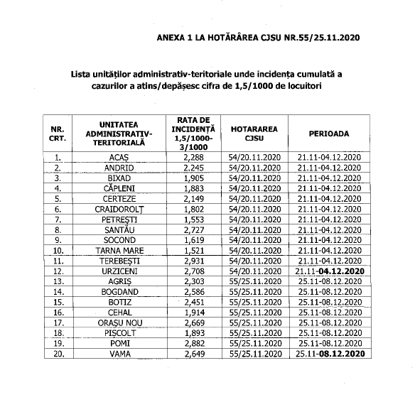 Pe de altă parte, un număr de 20 de localități se află sub incidența de 3 cazuri la mia de locuitori.
