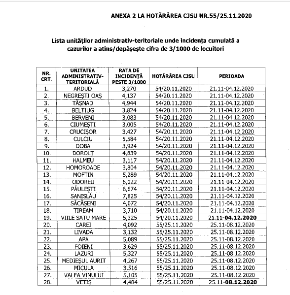 Prefectura Satu Mare anunță că la nivelul județului un număr de 28 de localități se află în scenariul roșu. De asemenea, în trei comune s-a depășit indicele de infectare care le-ar putea plasa în carantină.