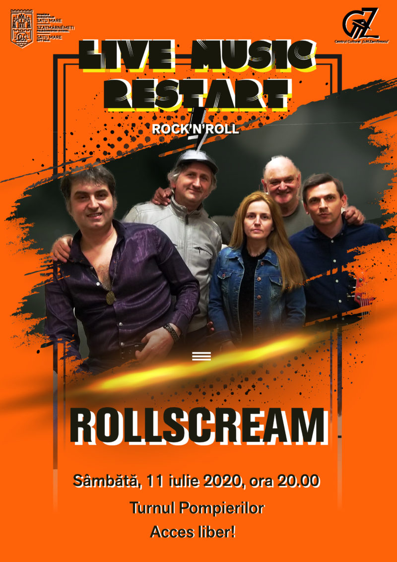 Vă invităm sâmbătă, 11 iulie a.c., ora 20.00 la un concert rock & roll cu formația Rollscream în Parcul ”Rudolf Fatyol”, lângă Turnul Pompierilor. Accesul este liber.