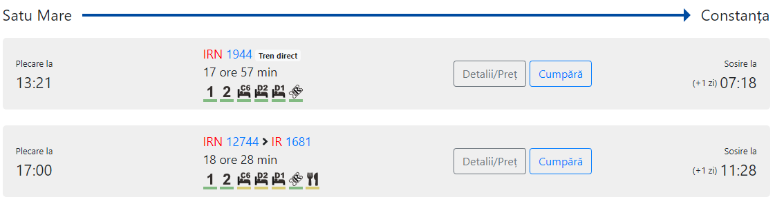 Circa 18 ore cu trenul de la Satu Mare la ConstanțaCFR Călători informează că, începând cu data de 14/15 iunie 2019, va lansa programul estival de transport “Trenurile Soarelui”. Timp de aproape trei luni, până la data de 8/9 septembrie, peste 40 de trenuri vor asigura zilnic legături directe din toată țara cu staţiunile de la Marea Neagră și Delta Dunării. Prețul unui bilet de la Satu Mare la Constanța, la clasa a II-a, pe scaun, este de 124 de lei, în timp ce la clasa I-a pe scaun este de 177,55 lei. În schimb, prețul unui bilet la vagonul de dormit, cu două paturi, este de 250 de lei. În ceea ce privește durata călătoriei, aceasta este de circa 18 ore.