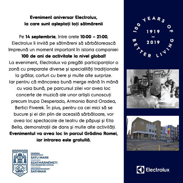 Sâmbătă, 14 septembrie, cu ocazia aniversării a 100 de ani de activitate la nivel global, Electrolux face un cadou sătmărenilor și angajaților săi și îi așteaptă pe toți la un eveniment special, cu multe surprize. Evenimentul va avea loc în Grădina Romei, între orele 10:00 – 21:00, iar accesul este gratuit.