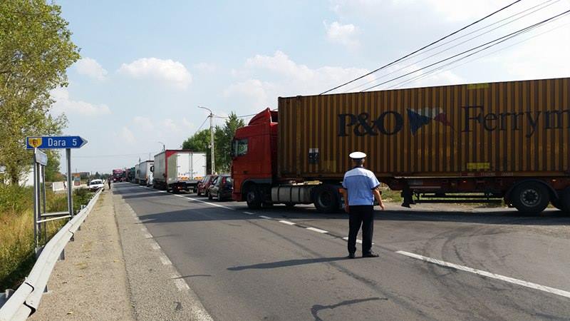 De aici, peste o sută de TIR-uri se îndreaptă înspre Punctul de trecere al frontierei de stat de la Petea. La un moment dat, timp de mai multe minute, protestatarii au blocat AMBELE sensuri de circulație. Polițiștii de la rutieră au intervenit hotărât și i-au convins pe șoferi să reintre în rând!