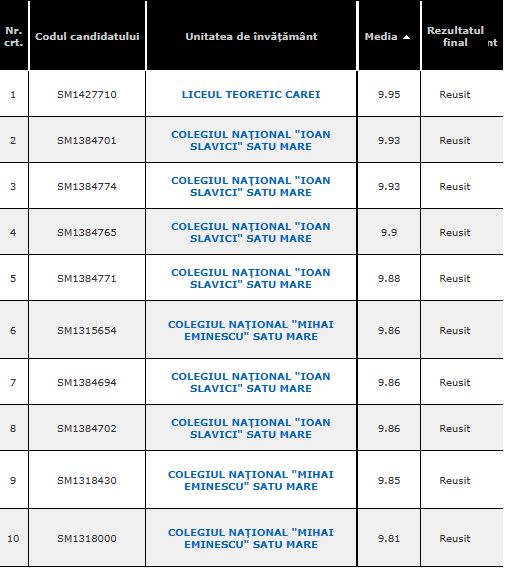 Potrivit datelor publicate, Liceul Teoretic Carei, Colegiul Național "Mihai Eminescu" și Colegiul Național "Ioan Slavici" își împart nu doar primele zece poziții, ci și primele 20.