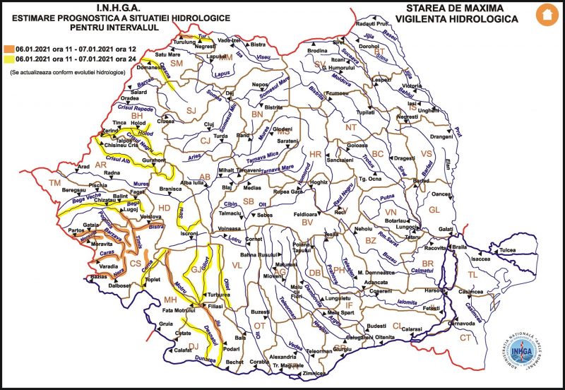 În intervalul 06.01.2021 ora 11:00 – 07.01.2021 ora 12:00, pe râurile din bazinul hidrografic Tur – sector aval de acumularea Călineşti-Oaș se instituie un Cod portocaliu de inundații.