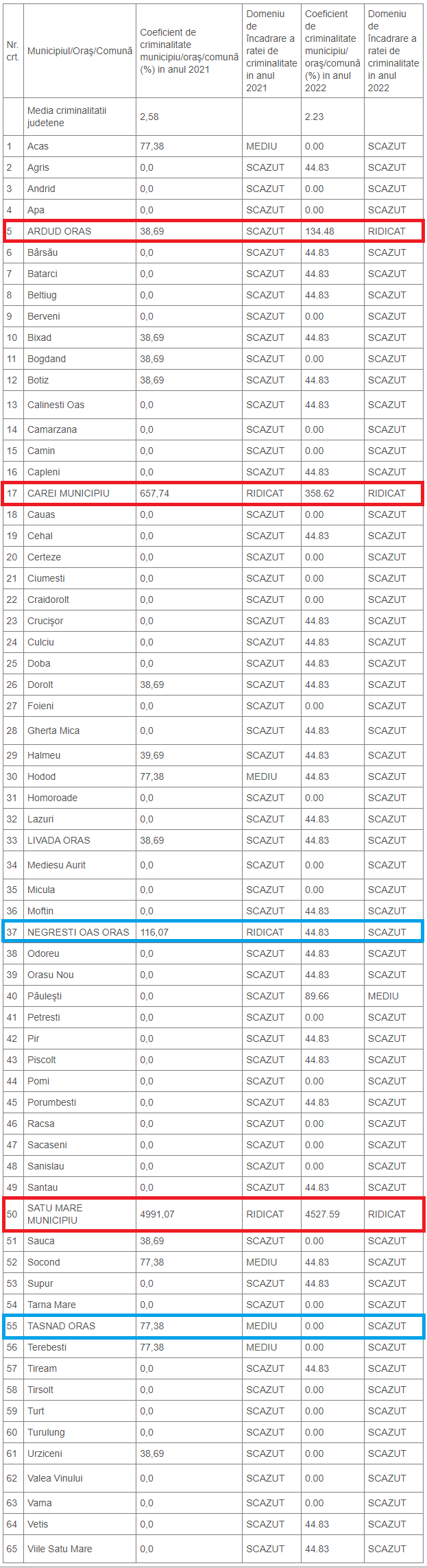 De departe, cel mai nesigur oraș din județul nostru este tocmai municipiul Satu Mare. Potrivit datelor Inspectoratului Județean de Poliție, consultate de PresaSM, calificativul în anul 2021 și 2022 a fost RIDICAT. Coeficientul de criminalitate este, totuși, în scădere. De la 4991 în 2021, la 4527 în 2022. Pe locul secund în topul celor mai nesigure localități se află municipiul Carei, cu un nivel RIDICAT al ratei de criminalitate. Totuși, este important de precizat că indicele de criminalitate a scăzut cu JUMĂTATE în municipiul Carei, de la un coeficient de 657 în anul 2021 la doar 358 în anul 2022.