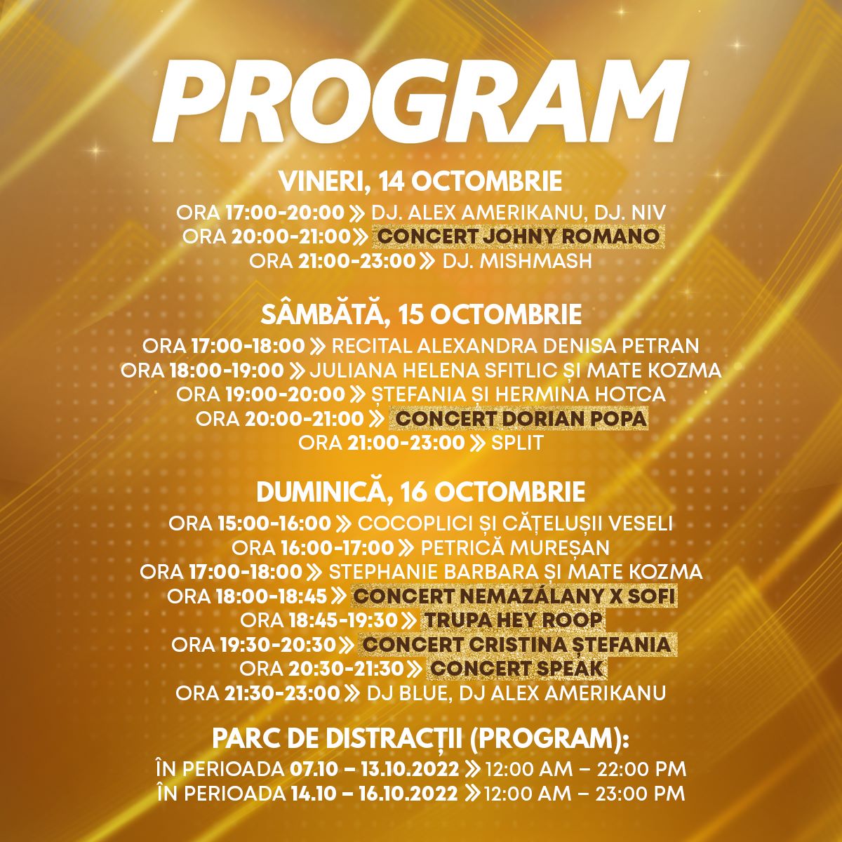Sunteți așteptați cu un super parc de distracții, preparate delicioase de la producători locali, activări pentru copii, DJ și concerte de zile mari. Dorian Popa, Cristina Ștefania, Speak, Johny Romano sunt doar câțiva dintre invitații speciali care vor urca pe scena din parcarea Shopping City Satu Mare. Nu rata distracția!