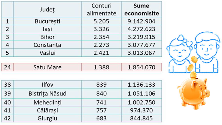 Potrivit datelor prezentate de Finzoom.ro, doar 1.388 de părinți au contribuit la Conturile Junior, plasând județul Satu Mare pe locul 22 de la coadă. Pe ultimul loc în topul național se află Giurgiu, cu puțin peste 680 de părinți contribuind la contul de economii. În regiunea de nord-vest, conturi mai puține decât în Satu Mare au fost alimentate în Bistrița-Năsăud, unde au fost deschise 840 de conturi, Sălaj, 1006, și în Maramureș, 1357. Nici Clujul nu stă foarte bine la acest capitol. Aici au fost alimentate conturile a 1.477 de tineri. În schimb, Bihorul se află în topul național pe locul trei la cele mai multe conturi alimentate, cu peste 2350. În ceea ce privește sumele existente în cont, Satu Mare se plasează pe locul 24. Cei mai mulți bani au fost depuși în conturile din București și Iași, care sunt pe primele locuri și la numărul de copii cu conturi active. Sumele care au fost economisite pentru tinerii sătmăreni se ridică la 1.854.070 lei.