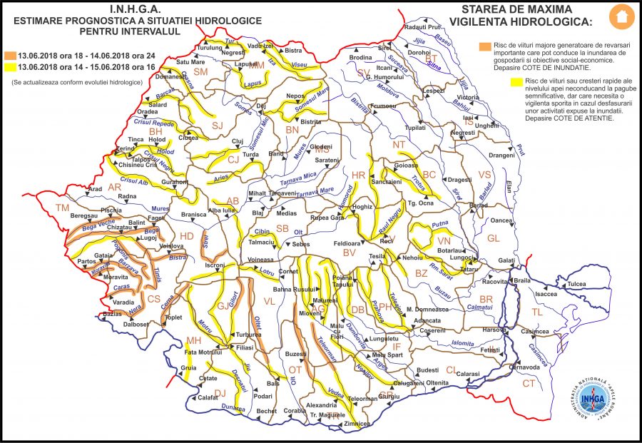 FENOMENELE VIZATE: Scurgeri importante pe versanţi, torenţi şi pâraie, viituri rapide pe râurile mici cu posibile efecte de inundaţii locale şi creşteri de debite şi niveluri pe unele râuri din bazinele hidrografice menţionate, cu depăşiri ale COTELOR DE APĂRARE.