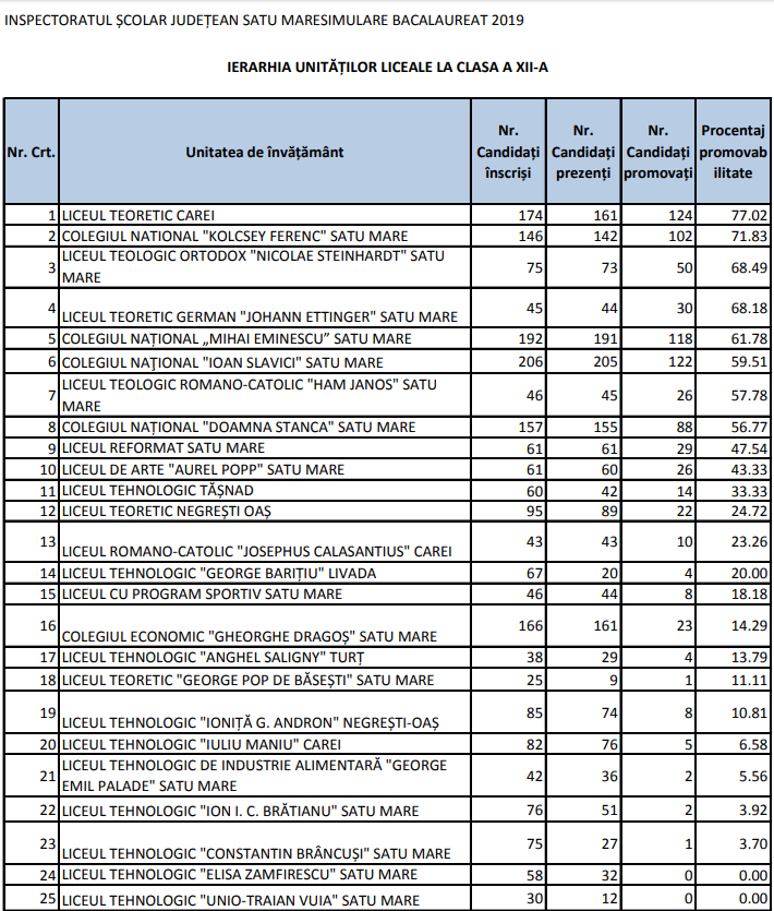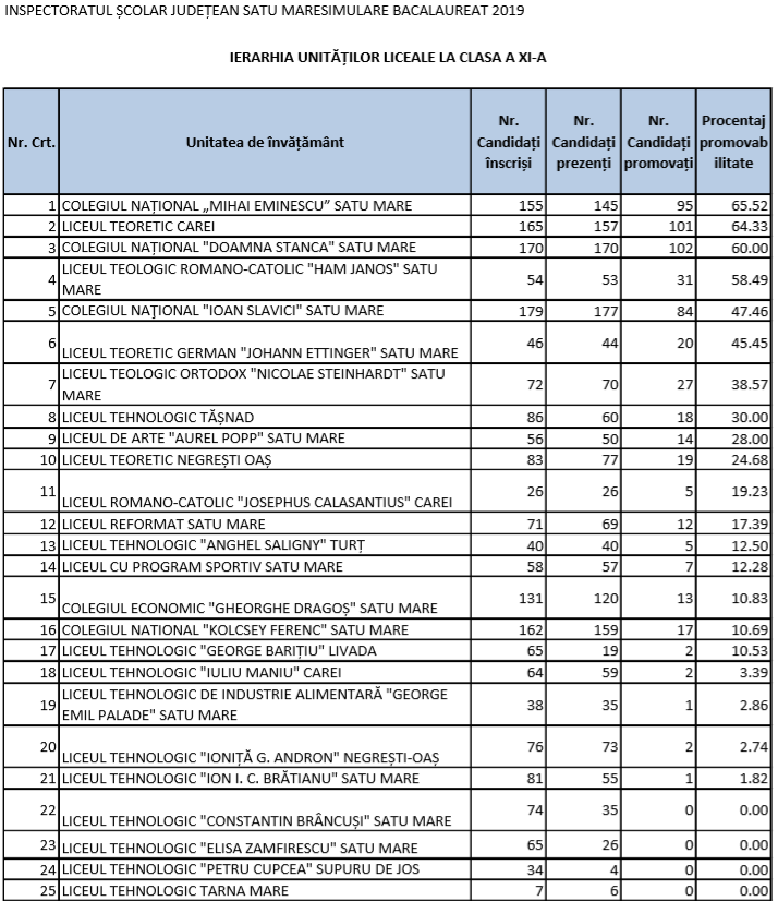 În conformitate cu datele centralizate de către Inspectoratul Școlar Județean Satu Mare, la simularea probelor scrise ale examenului de bacalaureat, la clasa a XI-a au obținut medii peste 6 un număr de 578 elevi, din cei 1.788 elevi care au fost prezenți la toate probele, ceea ce reprezintă o pondere de 32,33% (la simularea din 2018 ponderea a fost 36,11%, în 2017 ponderea a fost de 31,34%).