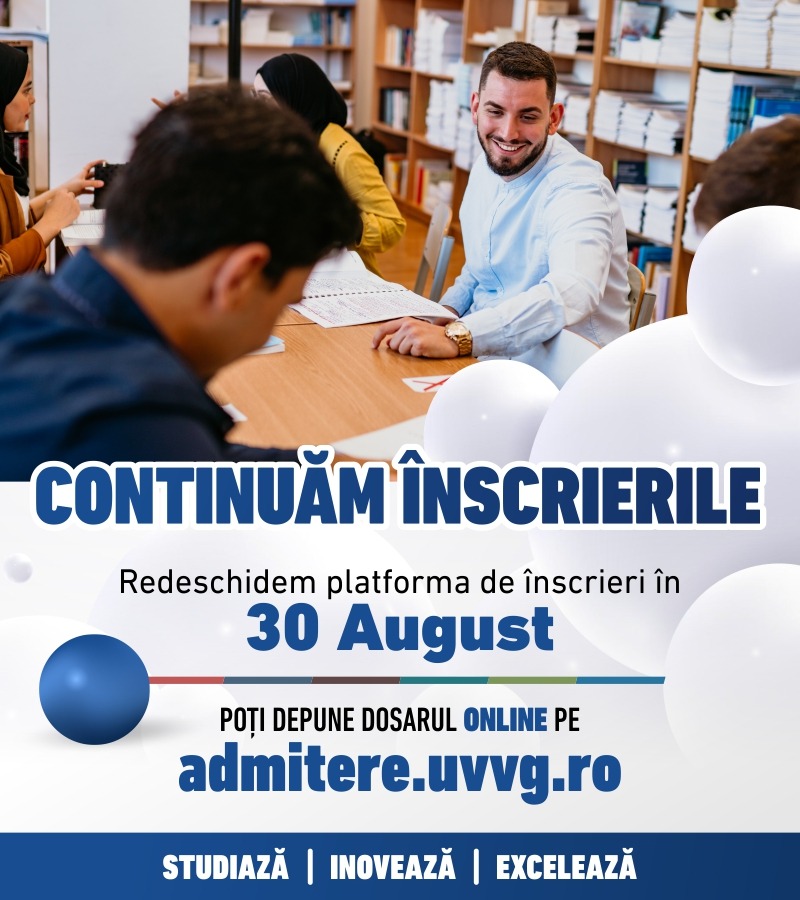 Se apropie a doua sesiune de admitere la Universitatea de Vest „Vasile Goldiş" din Arad, un brand al comunităţii locale care de peste trei decenii pregăteşte specialişti în diferite domenii. Cei interesaţi de locurile rămase neocupate după prima sesiune de admitere la unul din cele 43 de programe de licenţă, 25 de masterat şi două şcoli doctorale (Medicină şi Biologie), se pot înscrie începând cu 30 august la sediul rectoratului UVVG situat în plin centrul oraşului, pe B-dul Revoluţiei Nr. 94-96. O echipă tânără, dinamică, coordonată de prof. Cristian Benţe, prorector pentru strategia academică şi programe de studii, îi aşteaptă pe viitorii studenţi pentru consiliere. Mai mult, Centrul de Consiliere şi Orientare în Carieră din cadrul Universității de Vest „Vasile Goldiș" din Arad oferă sprijin studenților în ceea ce privește orientarea în carieră, dezvoltarea personală și optimizarea învățării.