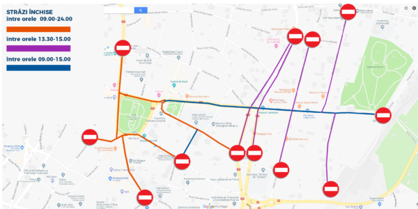 Între orele 09.00-24.00: Piaţa Libertăţii; Str. Ştefan cel Mare; Str. Păstrăvului; Str. Decebal; Str. 1 Decembrie; Str. Cuza Vodă până la intersecţia cu str. Gheorghe Lazăr
