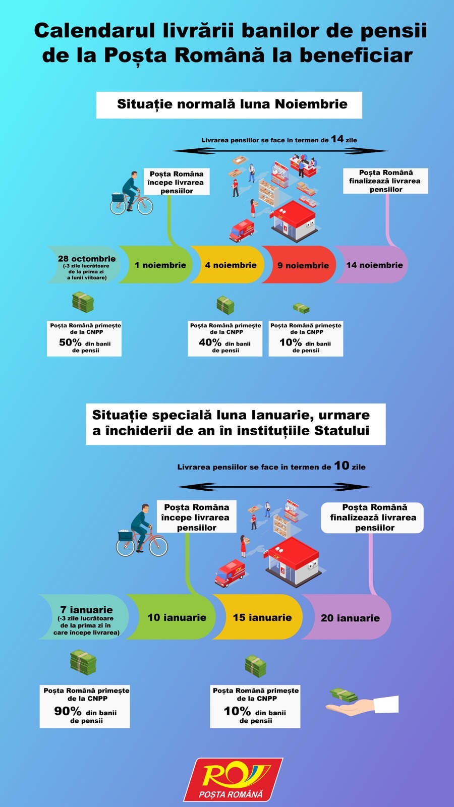 Compania promite că, la fel ca în 2019, pensiile vor fi livrate, şi anul acesta, în timp record, până pe 20 ianuarie. Poșta Română a publicat și un infografic prin care explică modul în care sunt distribuiți banii către pensionari.