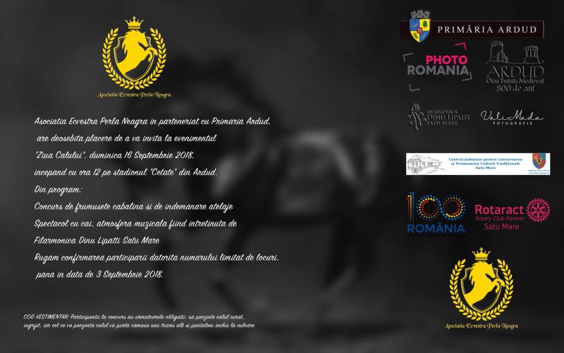 Asociația Ecvestră ”Perla Neagră” sărbătorește duminică, 16 septembrie, Ziua Calului. Evenimentul va fi găzduit de orașul Ardud, în zona Stadionului Cetate, cu începere de la ora 12.00.