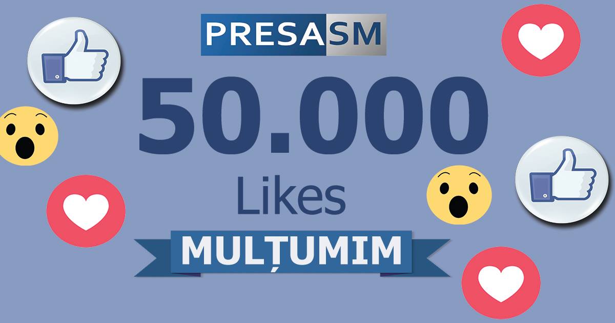 Site-ul de știri PresaSM a atins pragul de 50.000 de LIKE-uri pe pagina de Facebook. La care se adaugă peste 54.000 de urmăritori! În trei ani de când a văzut ”lumina zilei”, PresaSM a avut cea mai rapidă creștere din județul Satu Mare. Fără niciun fel de artificii tehnice, totul bazându-se pe opțiunea sinceră a cititorilor.