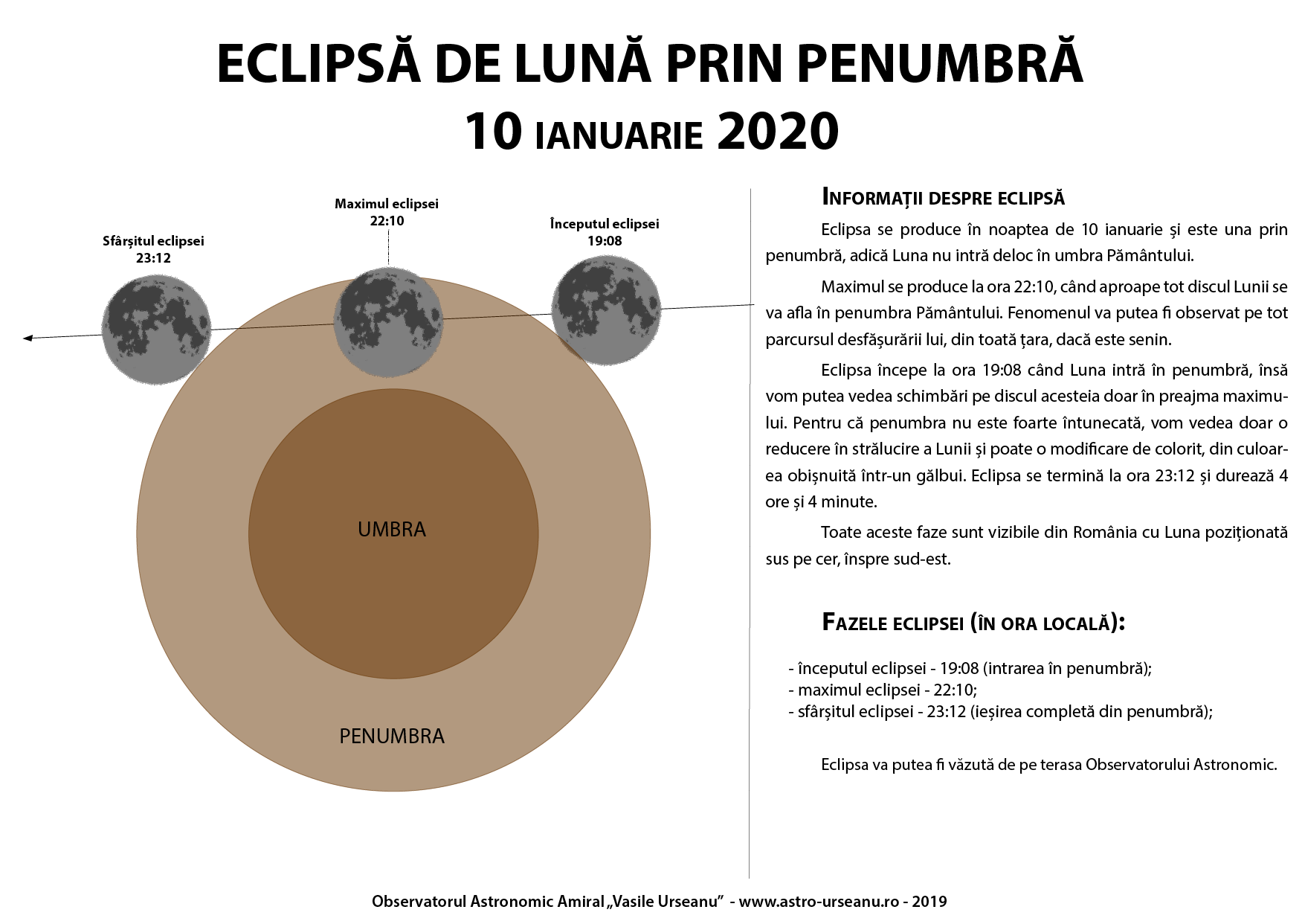Fenomenul astronomic debutează la ora 19:08 (intrarea în penumbră) şi se încheie la ora 23:12 (cu ieşirea completă din penumbră). Faza maximă a eclipsei are loc la ora 22:10 când aproape tot discul Lunii se va afla în penumbra Pământului. Pentru că penumbra nu este foarte întunecată, vom putea observa doar o reducere în strălucire a Lunii, şi poate doar o modificare de colorit, din culoarea ei obişnuită într-un gălbui, explică astronomii de la Observatorul "Amiral Vasile Urseanu".