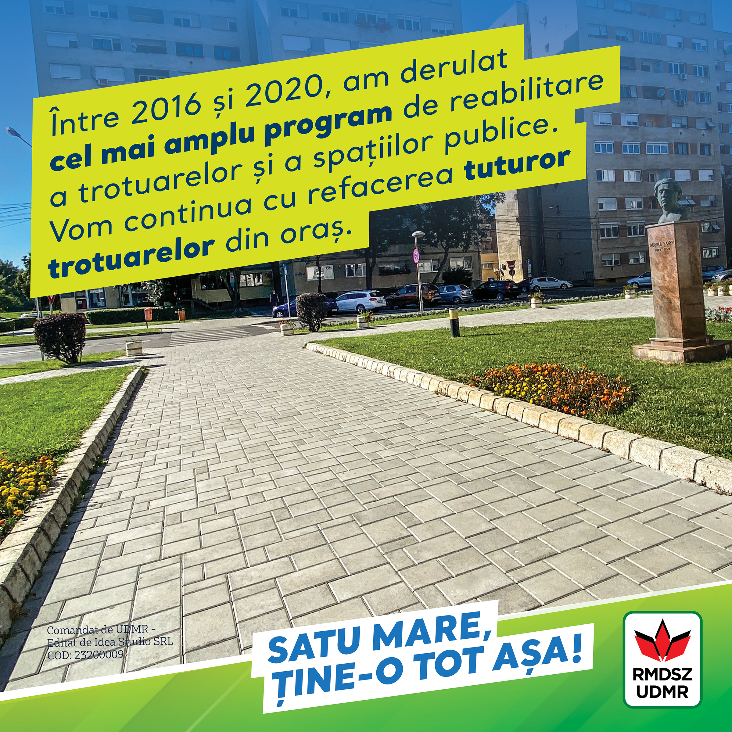 Am reabilitat trotuarele în următoarele locații: Piața 25 Octombrie, Grădina Romei, Parcul Titulescu, Eroii Revoluției, Soarelui, 14 Mai, Bulevardul Transilvania, Careiului, Calea Traian, I.C. Brătianu, 1. Decembrie 1918., Eugen Lovinescu, Al. Ioan Cuza, Unirii sugárút, Ion Creangă, Arad, Eroii Revoluției, Argeșului, Ilarie Chendi, Aviatorilor, Drăganilor, Nicolae Iorga, Toamnei, Mică, Fraternităţii, Egalităţii, Ion Ghica, Grigore Ureche, N. Titulescu, Gabriel Georgescu, Sighişoara, Gavril Lazăr de Purcărete, Dsida Jenő, Rândunelelor, Barbu Ștefănescu Delavrancea, Lunca Sighet, B.P. Haşdeu, Ana Ipătescu, Bujorului, Nicolae Golescu, Tineretului, 9 Mai 1877, Anghel Saligny, Ilarie Chendi, G. Bacovia, Argeşului, Anton Pann, Luceafărului, Ion Neculce, Parcului, Almaşului, Ioan Slavici, Wolfenbüttel, Marsilia, Ceahlăului, Paris, George Coşbuc, Turturelelor, Iancu Jianu, 1 iunie, pasajul Ștefan Ruha, Diana, Ferăstrău, Digului, Mărăști, Depozitelor, Mureşului, Jiului, Târnavei, Oituz, Sadoveanu, Milcov, Iuliu Coroianu, Brânduşa, Făgăraşului, Muşeţel, Iasomiei, piața Rodului, Zenit, Proiectantului, Jubileului, Braşov, Vulturului, Fântânele, Cerbului, Postăvaru, parcarea Tei.