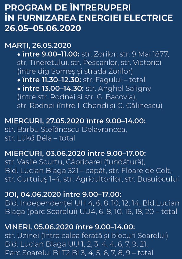 Societatea de distribuție a energiei electrice anunță întreruperi programate în alimentarea cu energie electrică, în municipiul Satu Mare, după cum urmează: