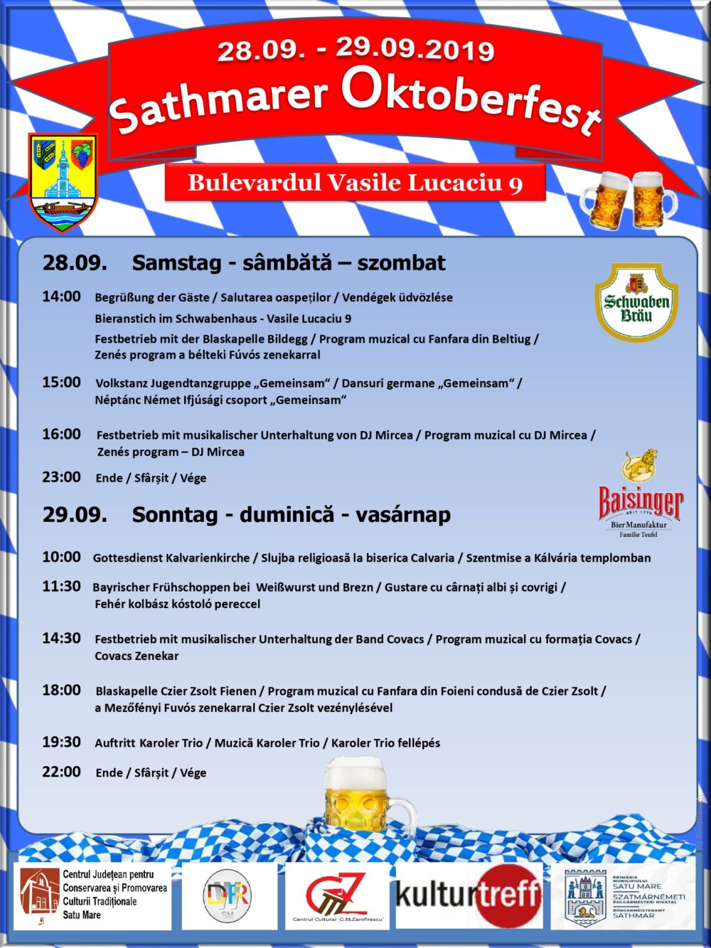 Evenimentul începe sâmbătă 28.09.19, de la ora 14:00 conform tradiției, primarul municipiului Satu Mare va deschide butoiul cu bere prin lovituri de ciocan. Fanfara din Beltiug, Fanfara din Foieni, grupe de dansuri traditionale svabesti si Karoler Trio vor întreține prin altele buna dispoziție.