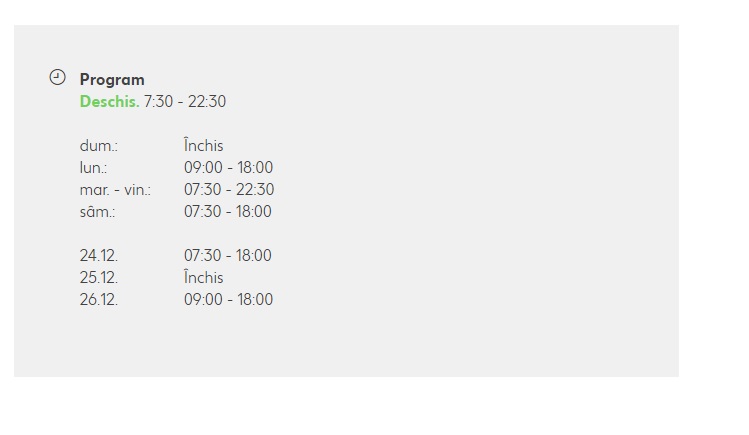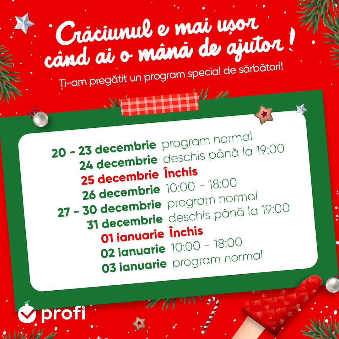 În perioada 19 – 23 decembrie și 27 – 30 decembrie 2022, activitatea magazinelor Lidl se va desfășura conform programului 07:00 – 22:00. În zilele de 24 decembrie și 31 decembrie 2022, clienții își vor putea face cumpărăturile în magazinele Lidl în intervalul orar 07:00 – 18:00. Pe 25 – 26 decembrie 2022 și 1 ianuarie 2023 magazinele Lidl vor fi închise. În data de 2 ianuarie 2023, orarul de funcționare al magazinelor Lidl va fi între 09:00 – 17:00, iar începând cu 3 ianuarie 2023 magazinele Lidl vor reveni la programul normal de funcționare, între 07:30 și 21:00.