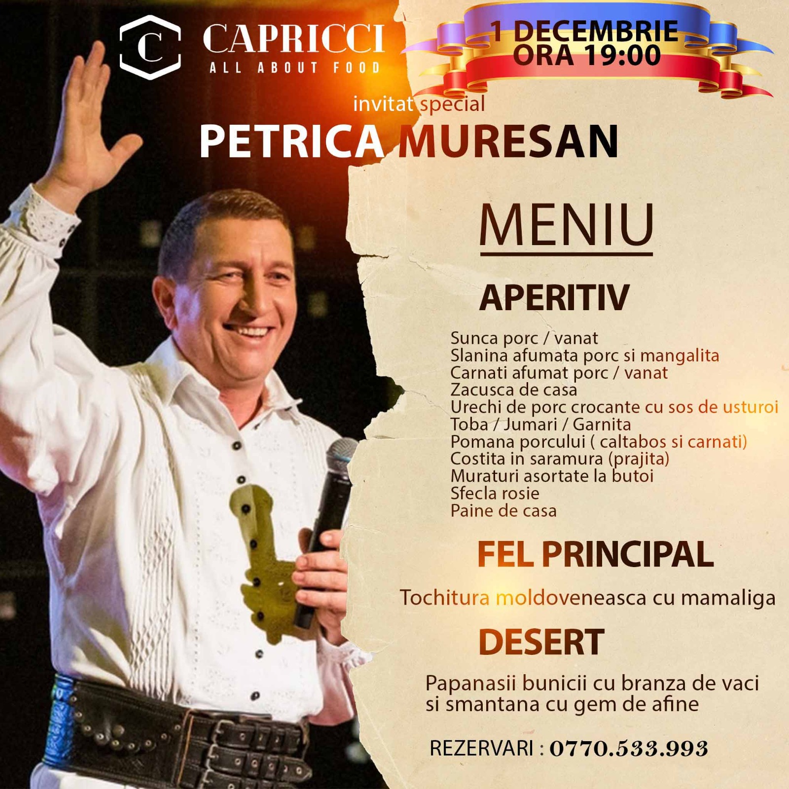 ,,Dacă și inima ta bate în spirit românesc, de 1 Decembrie vino alături de noi să sărbătorim în cel mai patriot mod mândria de a fi români! Mâncăruri cu gust autentic românesc, muzica celui mai iubit artist sătmărean și… câteva surprize!'', este mesajul celor de la Capricci.