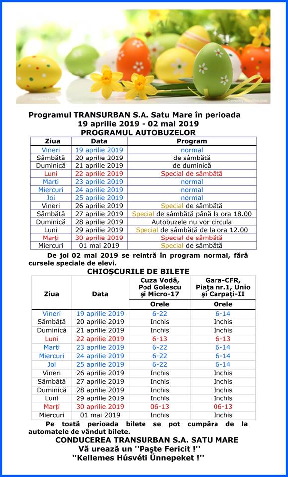Transurban anunță un program special de sărbători. Credincioșii catolici vor celebra Paștele la finalul săptămânii, iar pe 28 aprilie se va sărbători Paștele ortodox. Programul normal va fi reluat abia după data de 1 Mai.