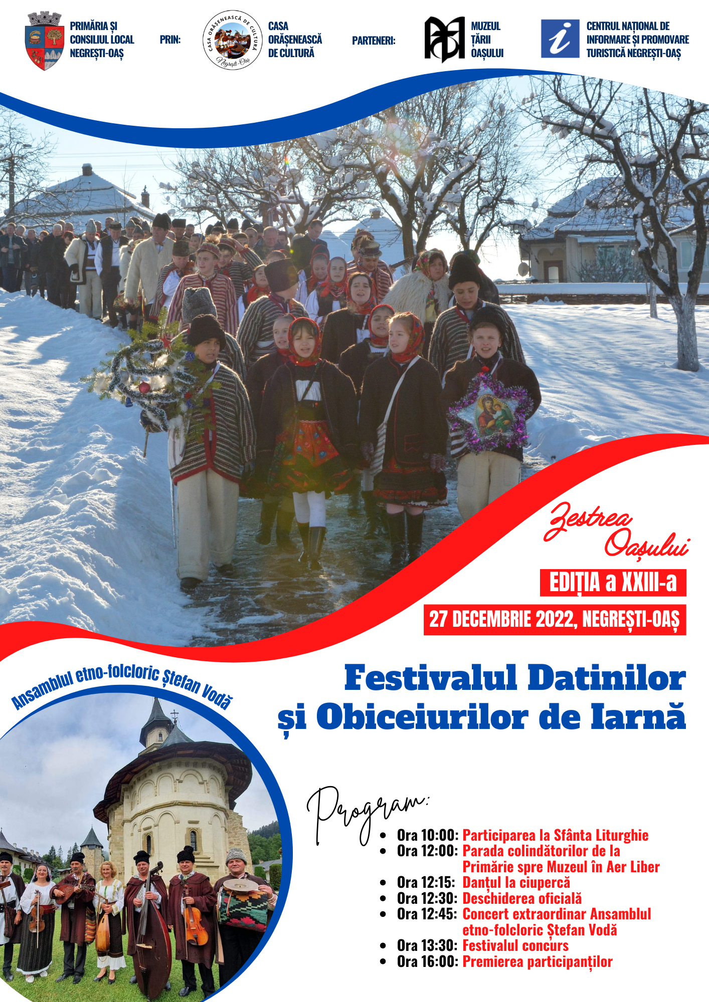 A XXIII-a ediție a Festivalului Datinilor şi Obiceiurilor de Iarnă va avea loc marți, 27 decembrie 2022, la Negrești-Oaș. La tradiționalul eveniment sunt așteptate 12 ansambluri folclorice, cete și grupuri de colindători din Țara Oașului și din zonele etnografice învecinate.