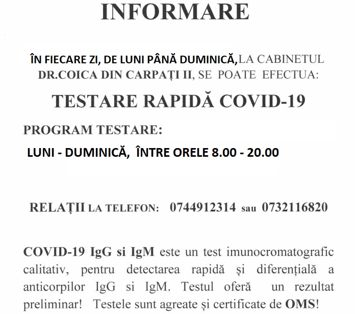 La Cabinetele Dr. Coica, situate în cartierul Carpați II, se poate efectua testarea rapidă Covid-19. Teste sunt agreate și certificate de Organizația Mondială a Sănătății! Este foarte important că est...