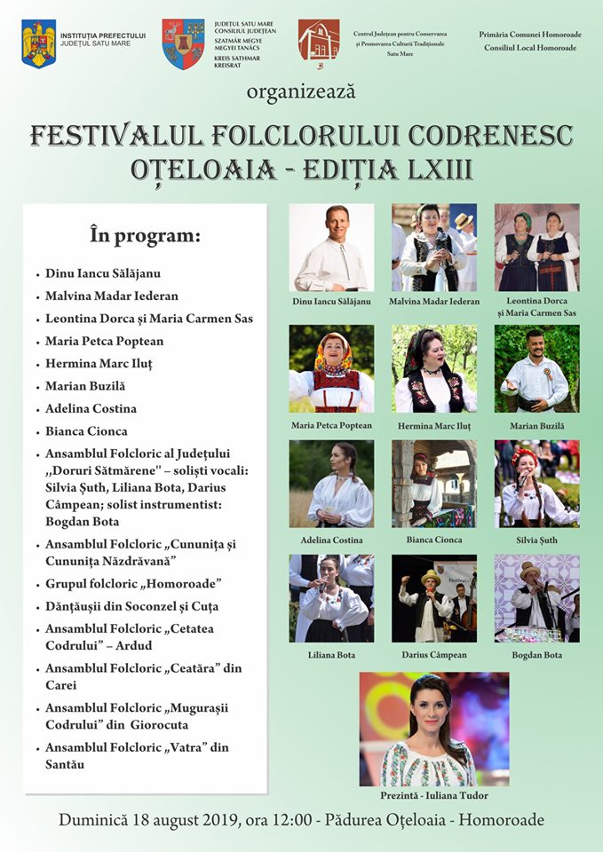 Duminică, 18 august la ora 12:00, va avea loc cea de-a LXIII-a ediție a Festivalului Folclorului Codrenesc ”Oțeloaia”, eveniment organizat de către Centrul Județean pentru Conservarea și Promovarea Culturii Tradiționale, cu sprijinul Consiliului Județean Satu Mare în colaborare cu Instituția Prefectului Județului Satu Mare, Primăria și Consiliul Local Homoroade.