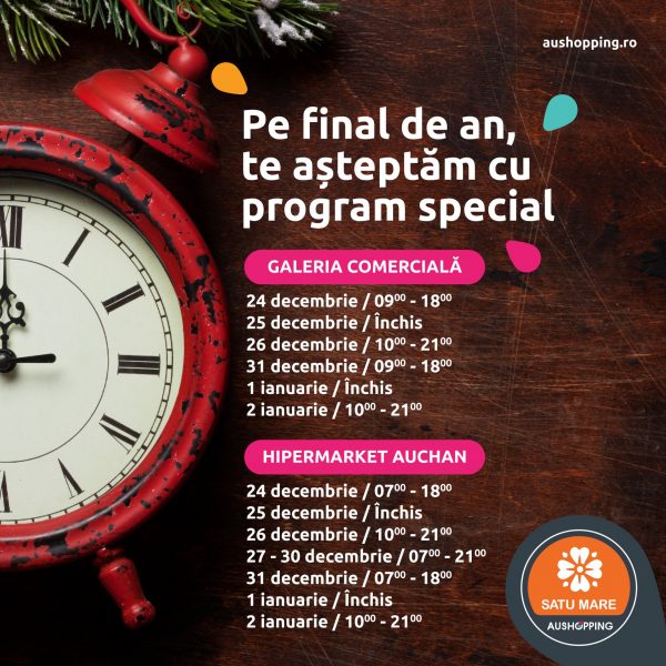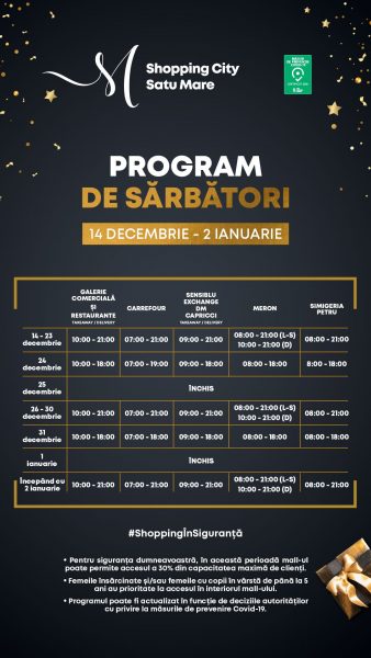 Supermarket-urile, hypermarket-urile și galeriile comerciale vor avea un program special de sărbători. De Crăciun toate magazinele vor fi închise, dar majoritatea se vor deschide, chiar dacă cu program redus, pe data de 26 decembrie.