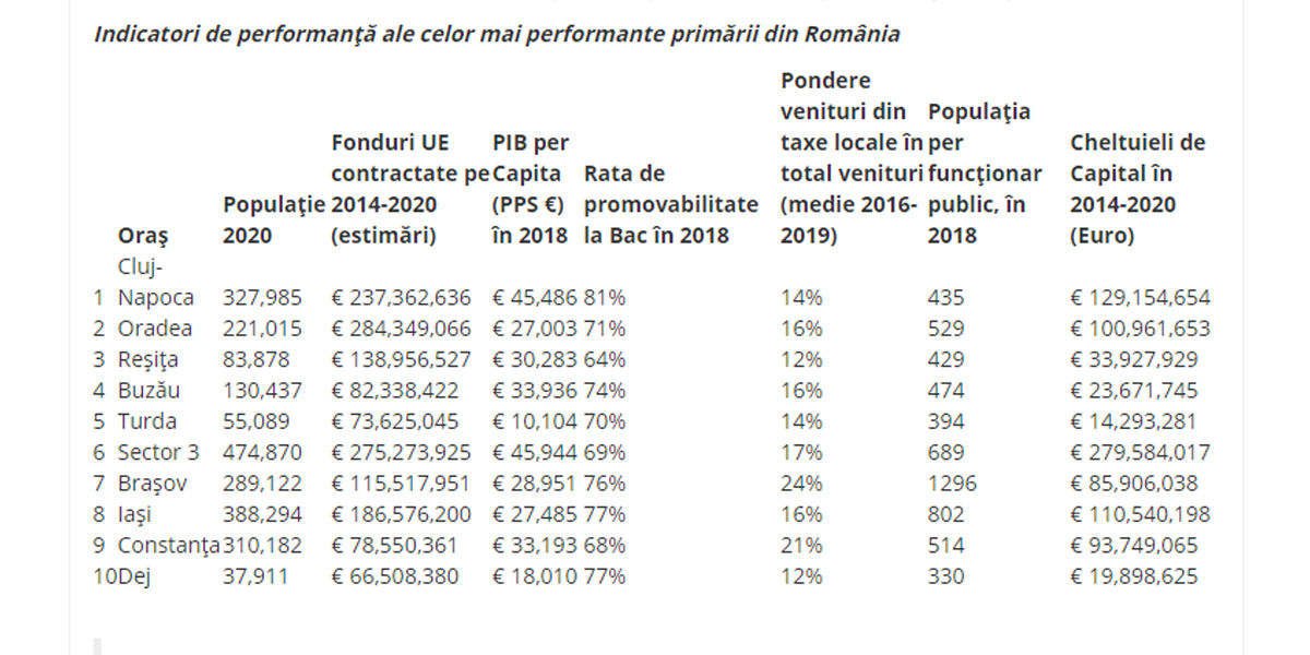Top realizat de către specialiștii de la UrbanizeHub, și care scoate în evidență performanța administrațiilor locale, s-a bazat în principal pe capacitatea administrațiilor locale de a mobiliza fonduri europene. Alte criterii luate în calcul au fost PIB-ul pe cap de locuitor, rezultatele școlare la examenele naționale, numărul angajaților din primării raportat la populație, cheltuielile de capital, dar și ponderea veniturilor din taxe locale în totalul veniturilor.