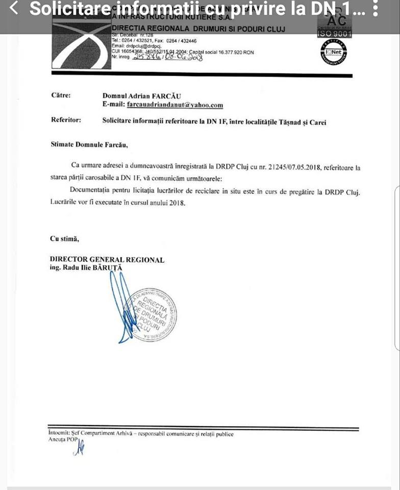 Drumul Național 1F, pe porțiunea Carei ș Tășnad, ar putea intra în reabilitare, potrivit unui răspuns oferit de către conducerea Direcției Regionale Drumuri și Poduri Cluj, la solicitarea lui Adrian Farcău, consilier local în orașul Tășnad.