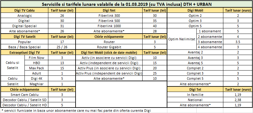 ”Pentru a răspunde nevoii continue de dezvoltare și de creștere a calităţii serviciilor pe care vi le furnizăm, precum și pentru a reacţiona la creșterea continuă a costurilor pe care le suportăm, suntem nevoiţi să ajustăm tarifele. Astfel, de la 1 martie 2019, preţurile anumitor servicii furnizate de Digi | RCS & RDS se vor modifica. Chiar și după aceste modificări, preţurile serviciilor Digi vor continua să fie foarte atractive. (...) În cazul în care nu sunteţi de acord cu oricare dintre aceste modificări, aveţi dreptul de a renunţa la respectivul/respectivele servicii în termen de 30 de zile de la data primirii prezentei notificări, fără plata vreunei penalităţi sau despăgubiri”, este anunțul celor de la DIGI.