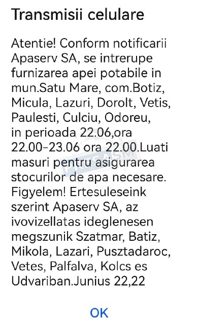 ”Pe această cale ne cerem scuze pentru inconveniențe și vă rugăm să vă faceți stocurile necesare de apă pentru a trece peste această perioadă. Vă mulţumim pentru înţelegere!”, informează Apaserv Satu Mare.