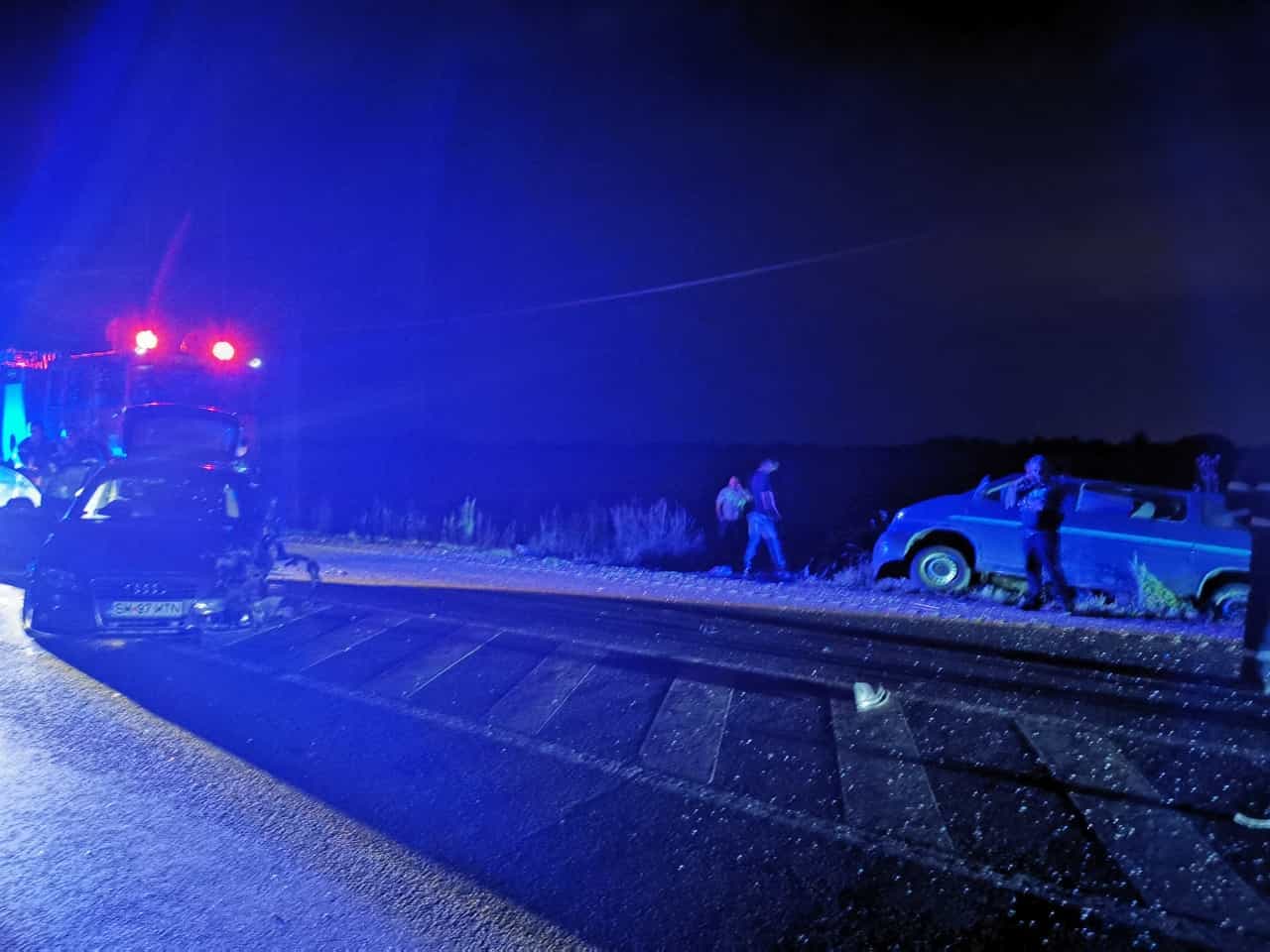 Se pare că vorbim despre un număr de nouă persoane rănite, după impactul între două autovehicule. Este vorba despre un microbuz de transport persoane și un autoturism AUDI. Dacă autoturismul AUDI a rămas pe partea carosabilă, microbuzul s-a oprit în șanțul de pe marginea drumului.