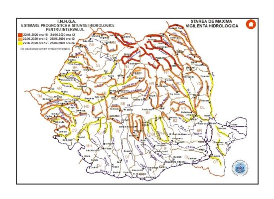 Astfel, în intervalul 22.06.2020 ora 12:00 – 25.06.2020 ora 12:00 pe râurile din bazinele hidrografice: Tisa - sector aval intrarea ȋn ţară, Vişeu, Iza, Tur (judeţele: Maramureş şi Satu Mare), Someşul Mare (judeţul Bistriţa Năsăud), Lăpuş (judeţul Maramureş), Someşul Mic – bazin superior şi afluenţi bazin mijlociu şi inferior (judeţele: Cluj şi Bihor), Someş – afluenţii mici aferenţi sectorului aval S.H. Dej (judeţele: Cluj, Sălaj, Maramureş şi Satu Mare), Crasna (judeţele: Sălaj şi Satu Mare), Ier – bazin superior şi afluenţi bazin mijlociu (judeţele: Satu Mare şi Bihor), va fi valabil un Cod portocaliu de avertizare, spun cei de la INHGA.