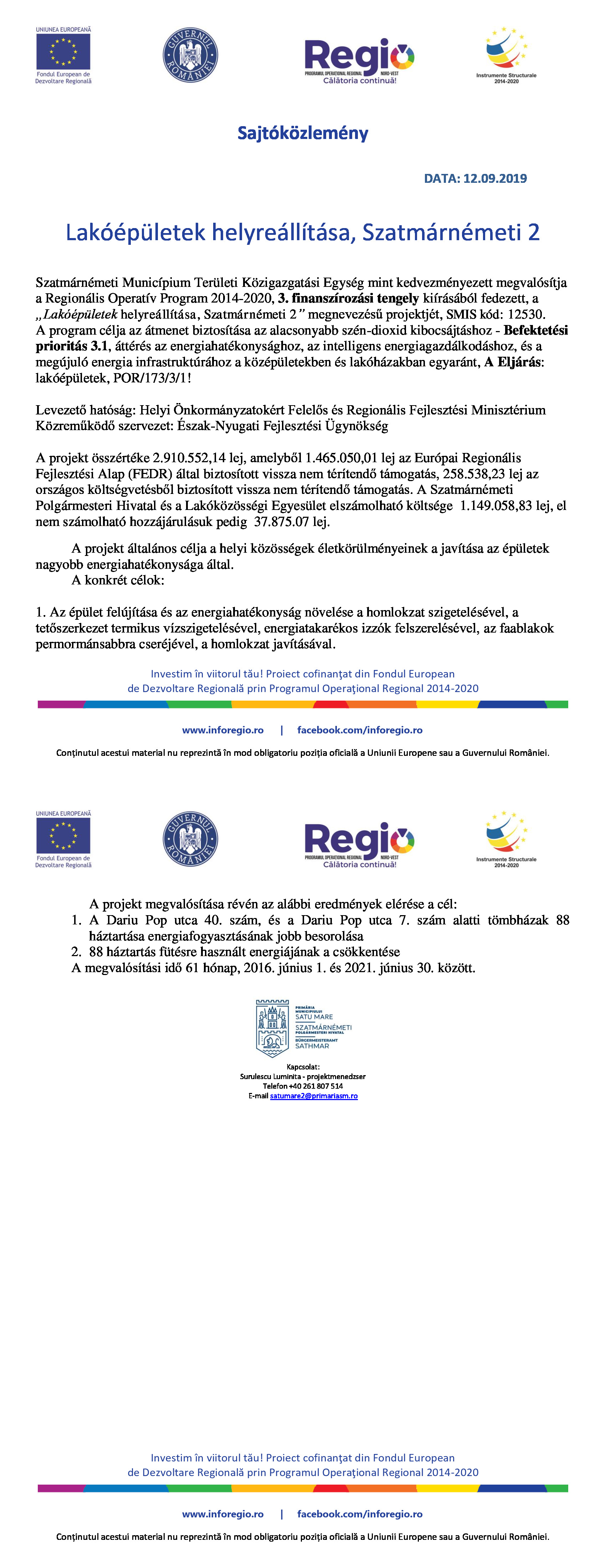 Sajtóközlemény: ”Lakóépületek helyreállítása, Szatmárnémeti 2”