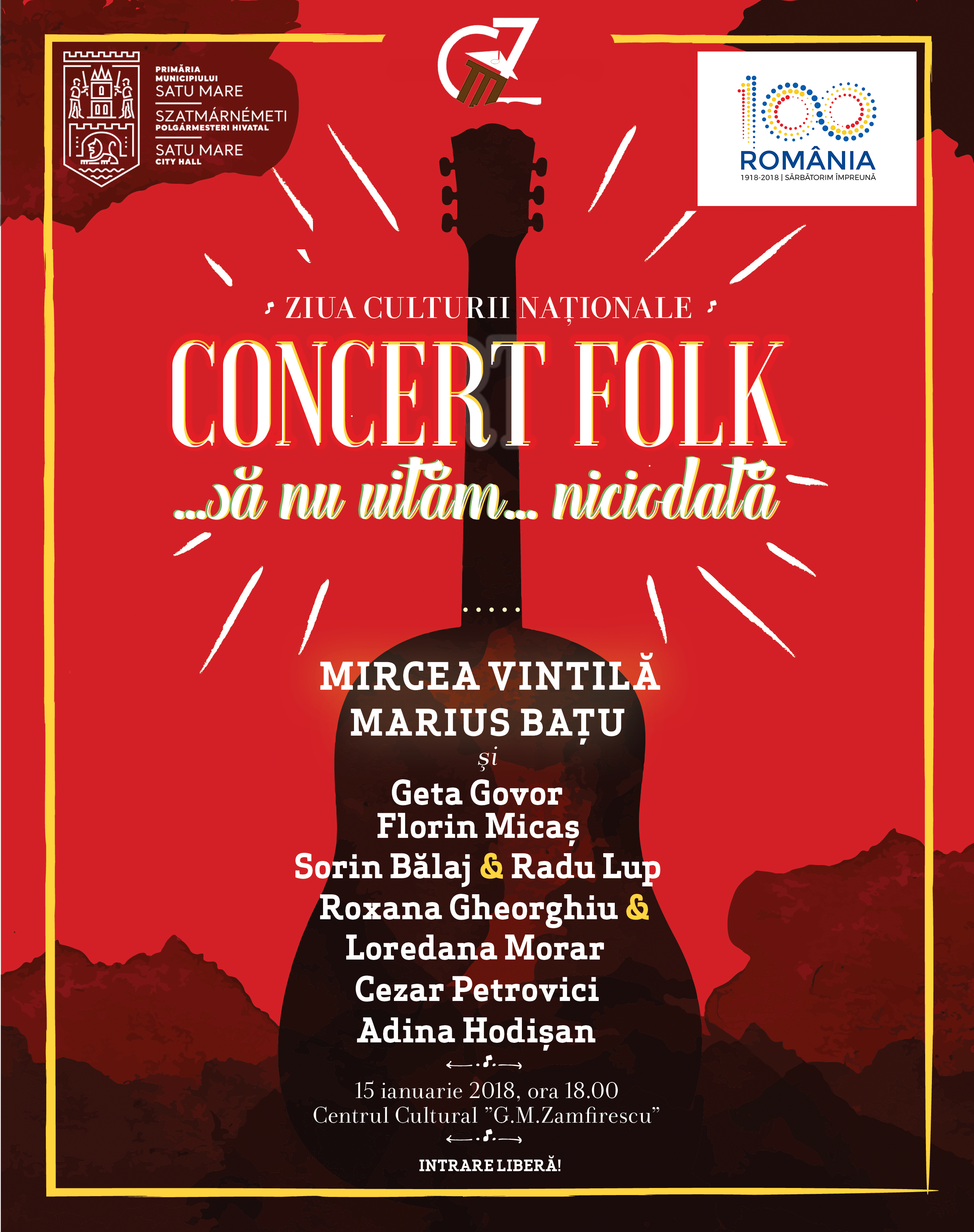 Centrul Cultural ”G.M.Zamfirescu” va găzdui luni, 15 ianuarie 2018, ora 18.00, concertul folk ”...să nu uităm... niciodată” dedicat Zilei Culturii Naționale. Participă artiștii: Mircea Vintilă, Marius Bațu, Geta Govor, Florin Micaș, Sorin Bălaj & Radu Lup, Roxana Gheorghiu & Loredana Morar, Cezar Petrovici, Adina Hodișan.