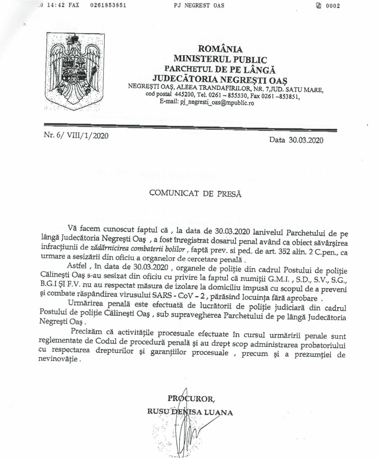 "Vă facem cunoscut faptul că , la data de 30.03.2020 la nivelul Parchetului de pe Lângă Judecătoria Negreşti-Oaş a fost înregistrat dosarul penal având ca obiect săvârşirea infracţiunii de zădărnicirea combaterii bolilor, faptă prevăzută și pedepsită de art. 352 alin. 2 Cod penal, ca urmare a sesizării din oficiu a organelor de cercetare penală. Astfel, în data de 30.03.2020 , organele de politie din cadrul Postului de poliţie Călineşti Oaş s-au sesizat din oficiu cu privire la faptul că numiţii G.M.I. , S.D., S.V., S.G., B.G.I ŞI F.V. nu au respectat măsura de izolare la dorniciliu impusă cu scopul de a preveni şi combate răspândirea virusului SARS - CoV - 2, părăsind locuinţa fără aprobare", spun procurorii sătmăreni.