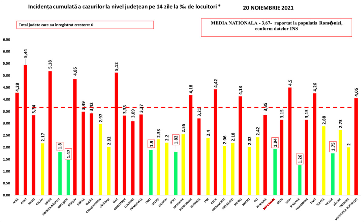 În regiunea de nord-vest doar Bistrița-Năsăud a înregistrat o incidență mai mică decât Satu Mare, respectiv de 1,8 cazuri la mia de locuitori, în ultimele 14 zile.