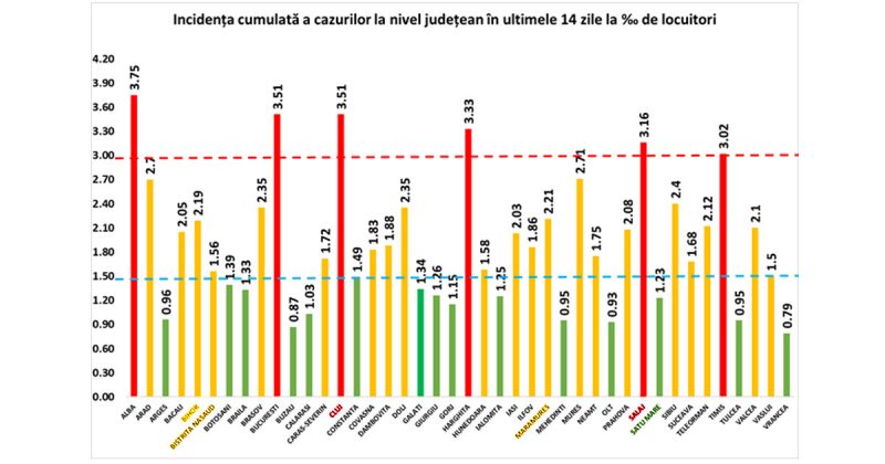 Cinci județe și Capitala au un indice de infectare mai mare de 3 la mia de locuitori. Dacă în cursul zilei de ieri, Sălajul a depășit rata de 3 și a ajuns în scenariul roșu, astăzi, Timiș a raportat o incidență de 3,02 la mie, fiind cel mai nou județ care depășește pragul de 3.